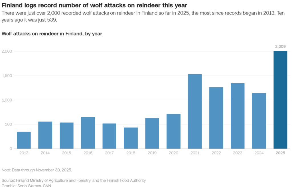 Ovviamente, dell’aumento del numero degli orsi, dei ghiottoni (mammiferi carnivori della famiglia dei mustelidi) e delle linci, nessuna traccia. In compenso, gli scienziati intervistati dalla CNN si affidano (oltre ad un insolito DNA ritrovato nelle feci di lupi) ad una tabella che dovrebbe attestare il legame tra l’aumento delle aggressioni dei lupi e la guerra in Ucraina.